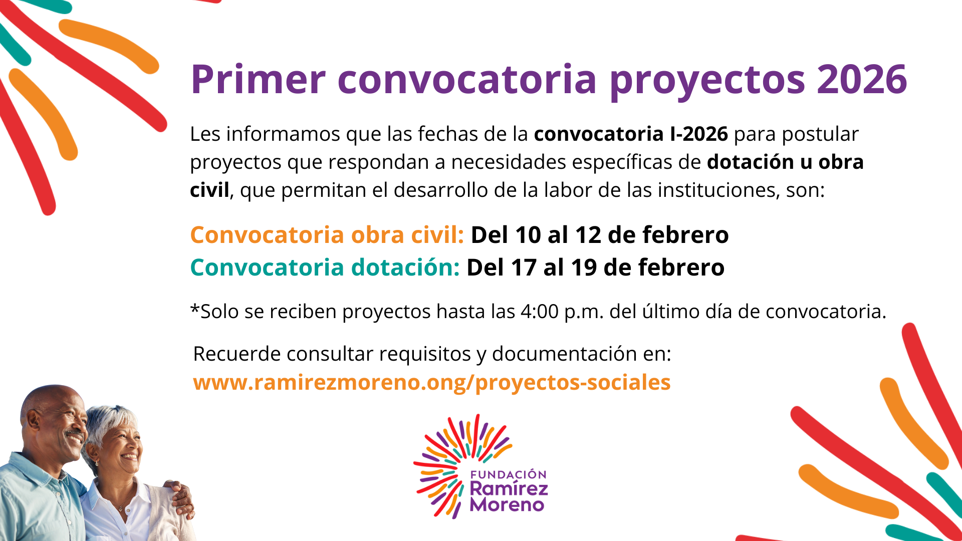 Proyectos que responden a necesidades específicas de dotación u obra civil que permitan el desarrollo de la labor social de las instituciones. Los proyectos sociales deben cumplir con cada requerimiento por parte de la Fundación Ramírez Moreno y solo serán recibidos en las convocatorias las cuales se  publican en la página web cuando se encuentran abiertas www.ramirezmoreno.ong